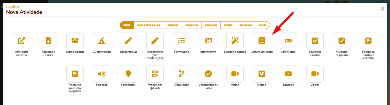 Localize e selecione atividade Leitura de texto, para facilitar você pode clicar no botão todos para exibir todos os tipos de atividades