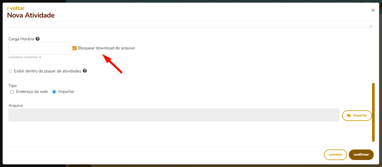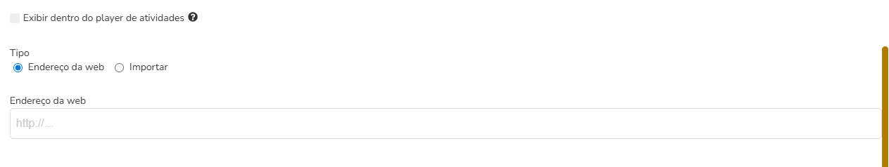 Ainda na tela Básico você pode adicionar o conteúdo da atividade, que pode ser uma URL onde o usuário será direcionado para fazer a leitura ou o download do texto. Ativando a opção Exibir dentro do player de atividade, esse texto será exibido na mesma página da atividade.