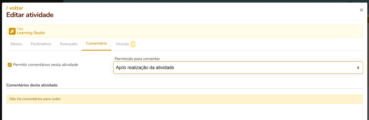 Nessa tela você pode habilitar a função comentário na atividade, permitindo que o usuário coloque um comentário durante a execução da atividade.