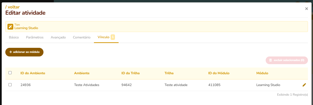 Nessa tela vinculamos a atividade a um Modulo clicando no botão + adicionar ao modulo.