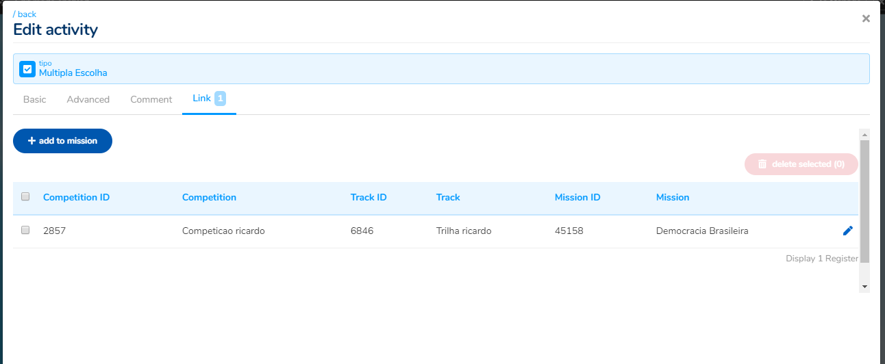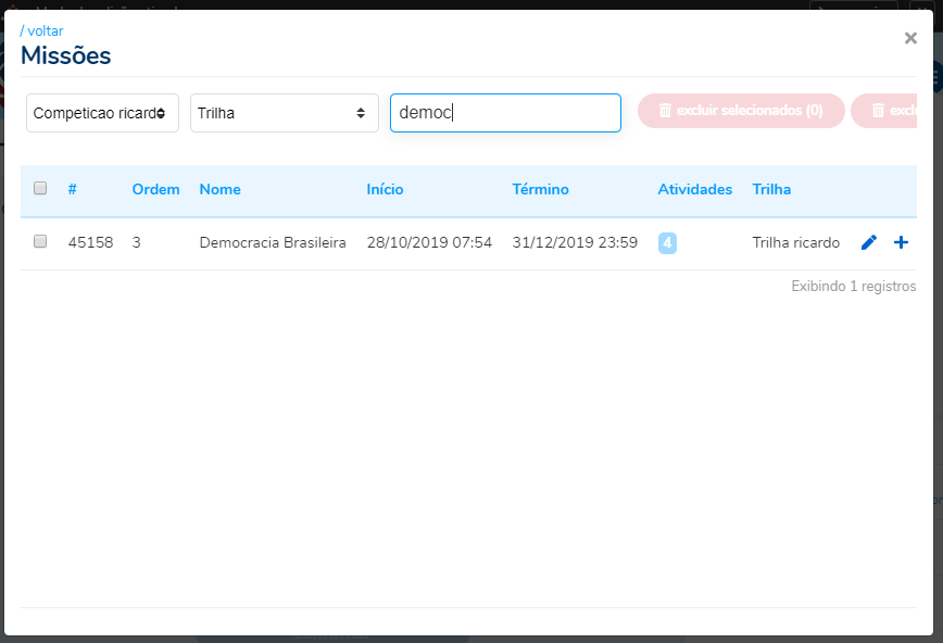 Foram inclusas as colunas de TrilhaId, Trilha, MissaoId e Missão para que o administrador possa identificar exatamente em quais missões a atividade está vinculada, conforme print abaixo: