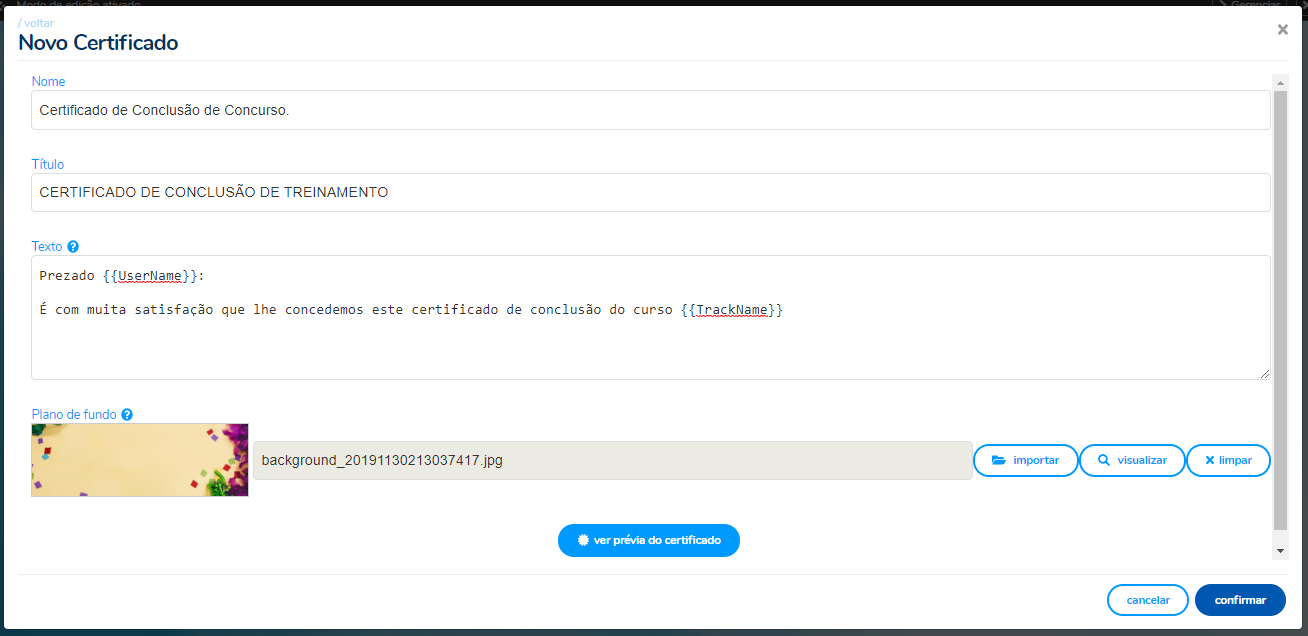 2. Preencha todos os campos solicitados na tela. Após preenchê-los, e enviar a imagem de fundo, será possível ver o preview do certificado, conforme as imagens abaixo: