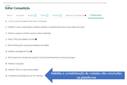 O administrador tem a possibilidade de fazer com que a pontuação parcial (de rodadas que os usuários ainda não finalizaram) já vão sendo contabilizadas nos rankings individual e de grupos a medida que os usuários vão respondendo as atividades das missões. Para habilitar este recurso, basta acessar a configuração "Contabilizar Pontuação Parcial nos Rankings", na tela de Configurações da Competição. Por padrão, esta configuração vem desabilitada.