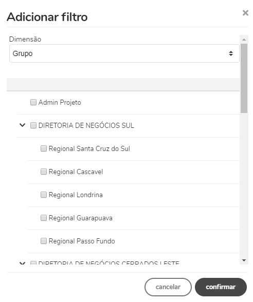 No filtro “Grupo” do Analytics, foi implementada a visualização em cascata, visando facilitar a seleção dos grupos e seus respectivos subgrupos.