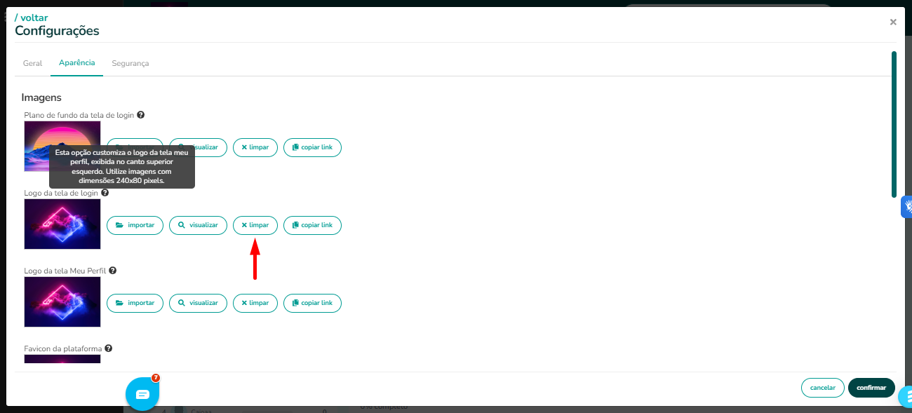 Para remover o ícone presente na tela de login é necessário realizar a limpeza do campo de configuração do logo da instância.