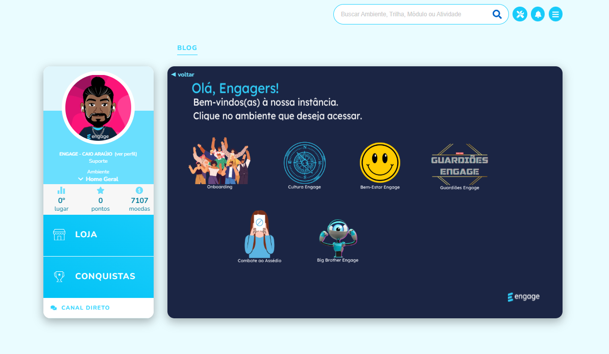 Outro ponto é que a barra de pesquisa será apresentada apenas nas telas de "Meu Perfil" e no "Ambiente". Quando o usuário estiver por dentro da atividade/módulo, ele não será visível.
