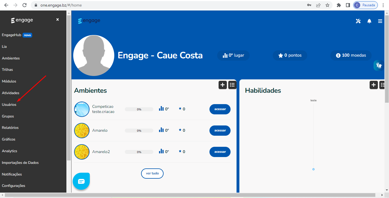 Feita a confirmação de que possui licença disponível pode prosseguir com a criação de usuários clicando em + Usuários: