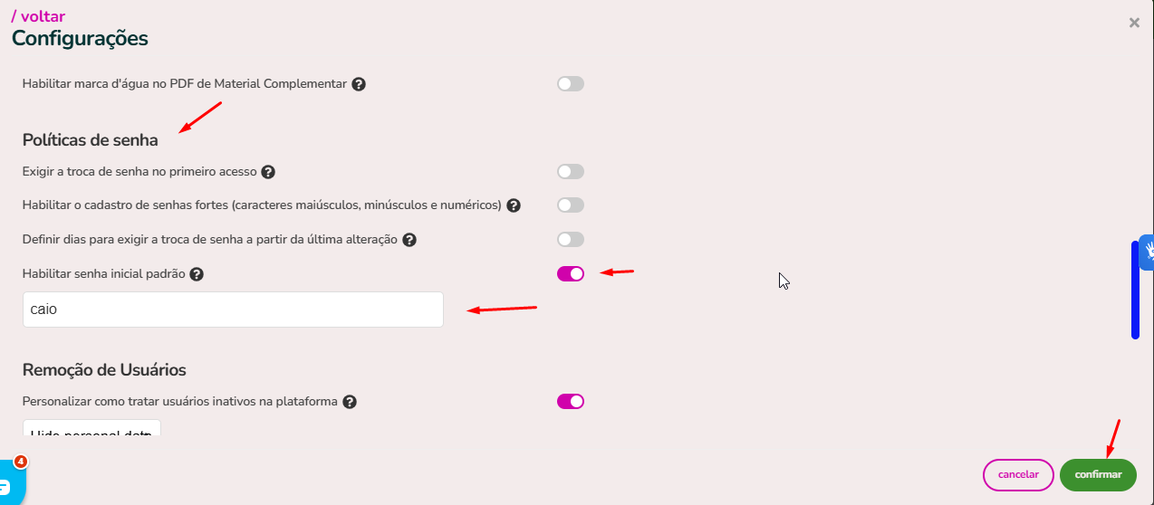 Para saber qual é a senha padrão de sua instância é necessário acessar o menu Configurações, navegue até a aba Segurança procure por Políticas de senha e habilite a opção Habilitar senha inicial padrão. Dessa forma, quando um usuário for criado, a senha padrão será exatamente a senha configurada nesse campo:
