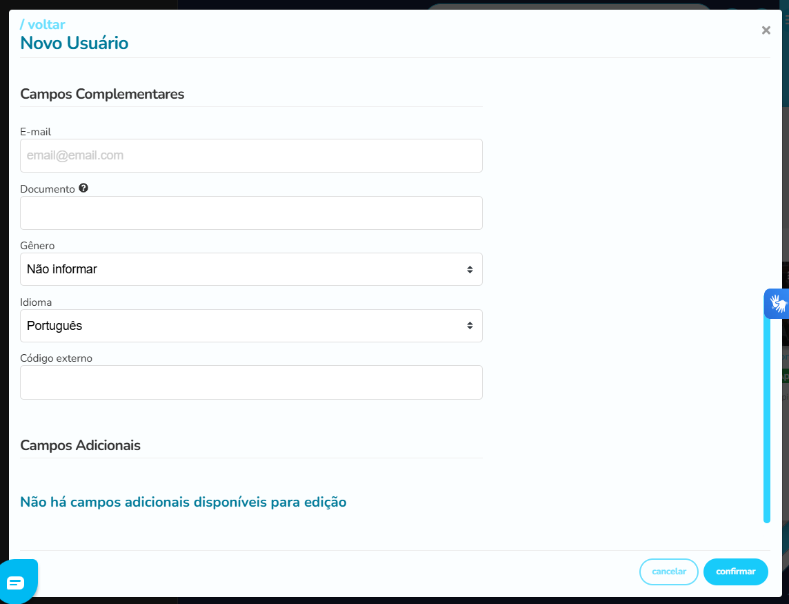 - Idioma: Campo para determinar o idioma que este cadastro irá visualizar elementos da plataforma.