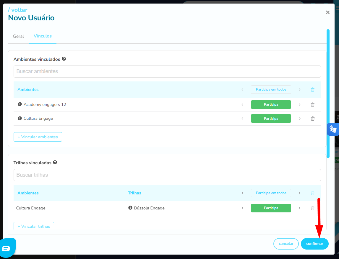 Nesta aba deverá determinar os treinamentos aos quais o usuário será vinculado.