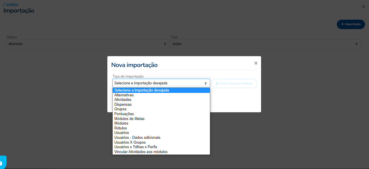 Você poderá acompanhar o andamento das importações através do filtro de “Status”: