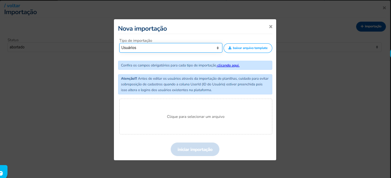 Antes de iniciar o processo de importação, certifique-se de não reutilizar uma planilha já utilizada em outra importação. O modelo de planilha (template) é atualizado com frequência, e a reutilização de planilhas antigas pode causar erros na importação.