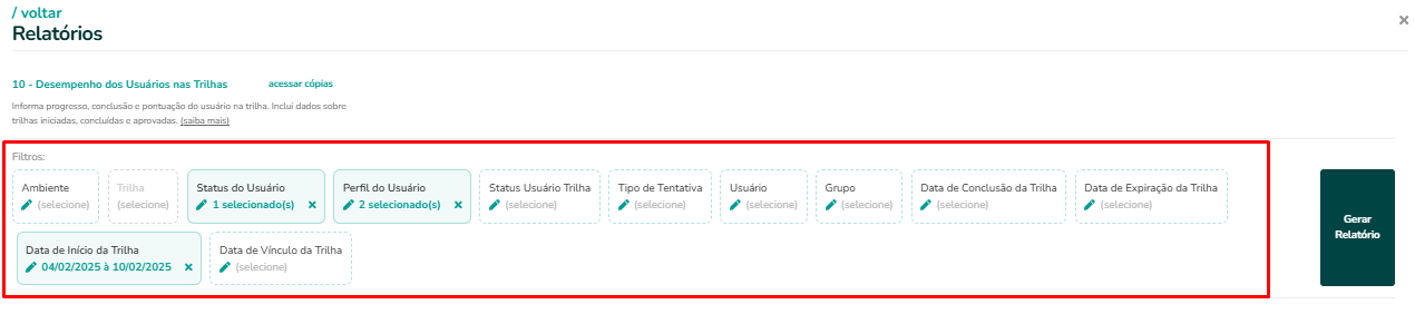 - Data de Inico da Trilha: Neste filtro é possível adicionar um filtro de data de um determinado período que a trilha foi iniciada.