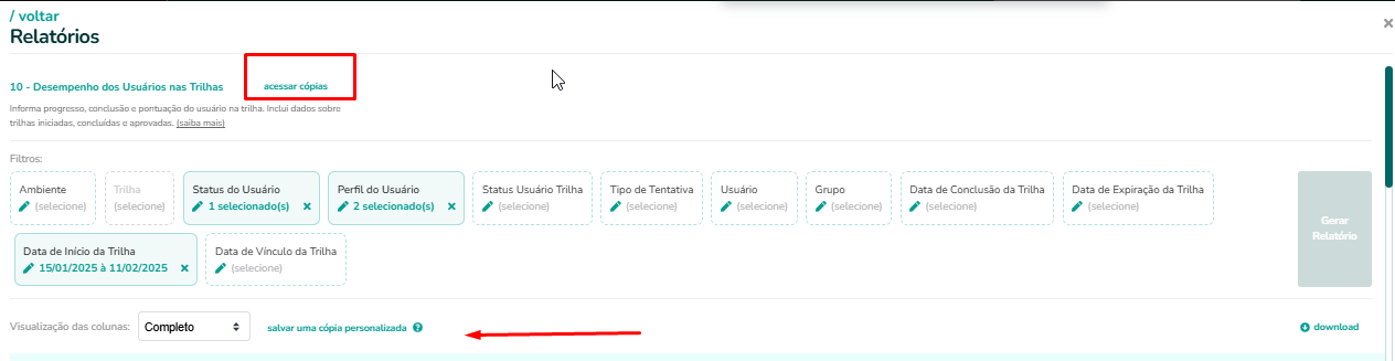 - Data de Conclusão da Trilha: Neste filtro é possível adicionar um filtro de data de um determinado periodo que a trilha foi concluída.