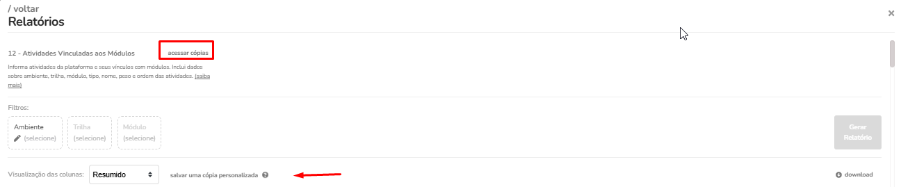 - Ambiente: Este filtro permite selecionar um ambiente específico para filtrar os dados do relatório. ao selecionar ambientes específicos também será possivel fazer filtros por Módulos e trilhas.