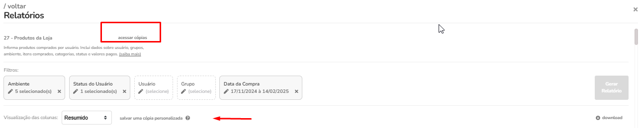 Ao clicar em acessar cópias você terá acesso os últimos relatórios gerados: