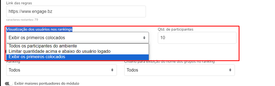 Exibir nos rankings apenas os módulos que os usuários participam: Ative a exibição apenas dos módulos que os usuários estão envolvidos, simplificando a visualização.
