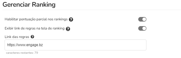 Exibição de Regras: Ative a exibição do link das regras na tela de ranking para garantir que todos estejam cientes das diretrizes. Essa opção permite configurar um link onde contenha as regras do ranking para que, caso os usuários tenham dúvida e questionem pontuações.