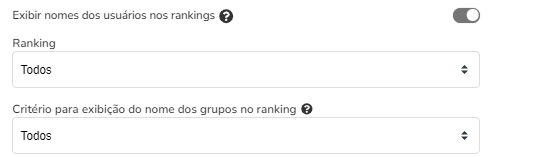 Exibir nomes dos usuários nos rankings: Escolha se os nomes dos usuários serão exibidos nos rankings, e selecionar qual ranking será exibido (Todos, Grupo ou Individual) e o Critério para exibição do nome dos grupos no ranking (Todos ou parcial)