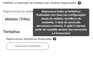 Reprocessar tentativas: Reprocessa o histórico de todos os usuários para que respeitem as configurações atuais do ambiente.