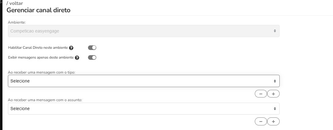 Na tela de Gerenciar canal direto, conseguimos realizar as configurações de ativar o canal direto e exibir as mensagens para o ambiente e configurar os destinatários para o tipo para cada tipo de destinatário.