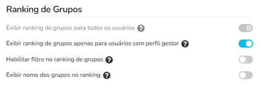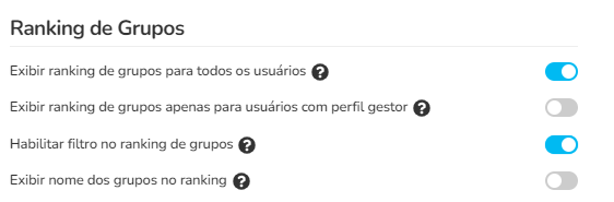 Exibir nome dos grupos no ranking: Esta opção, quando habilitada exibe os nomes dos grupos no ranking. Quando desabilitada, os nomes dos grupos são substituídos por termos genéricos "grupo1", "grupo2".