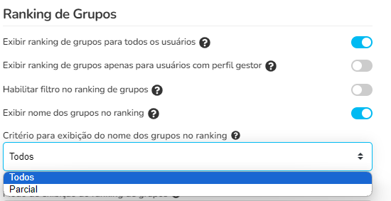Critério para exibição do nome dos grupos no ranking: Esta opção permite exibir o nome dos grupos na visualização total ou apenas na visualização parcial do usuário. Esta configuração tem relação com a opção "Regra de visualização do ranking de grupos".