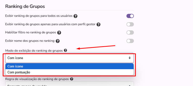 Modo de exibição do ranking de grupos: Nessa opção você escolhe com o ranking será exibido Com ícone ou Com Pontuação