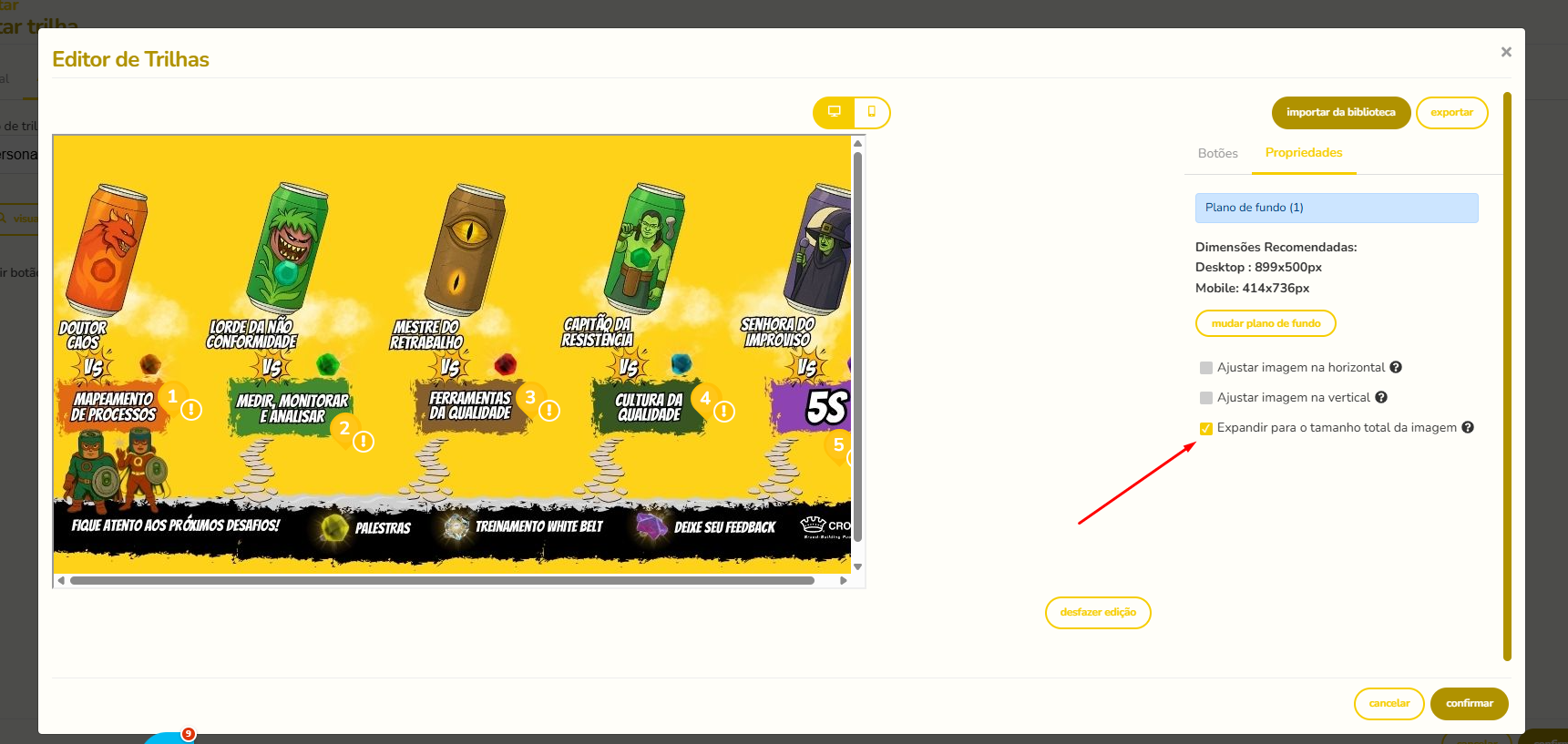 Obs.: Para utilizar a trilha personalizada em tela cheia, recomendamos optar pela trilha do tipo galeria. Isso porque, ao utilizar a trilha em tela cheia, as imagens não são responsivas, o que pode resultar na exibição desconfigurada dos pinos."