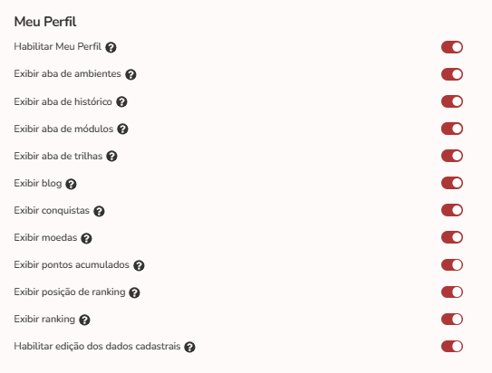 Meu Perfil: Na seção você pode configurar as informações que deseja exibir em "Meu Perfil" , permitindo que personalize os itens que serão exibidos. Mantendo um layout limpo e organizado para o usuário.