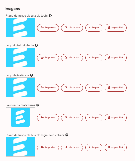 Imagens: Na seção de imagens, você pode adicionar ou remover elementos visuais importantes da sua instância. Isso inclui a possibilidade de definir o logotipo que será exibido em seu perfil, bem como o favicon da sua instância. Além disso, você pode personalizar o fundo da tela de login para criar uma experiência visual única para seus usuários.