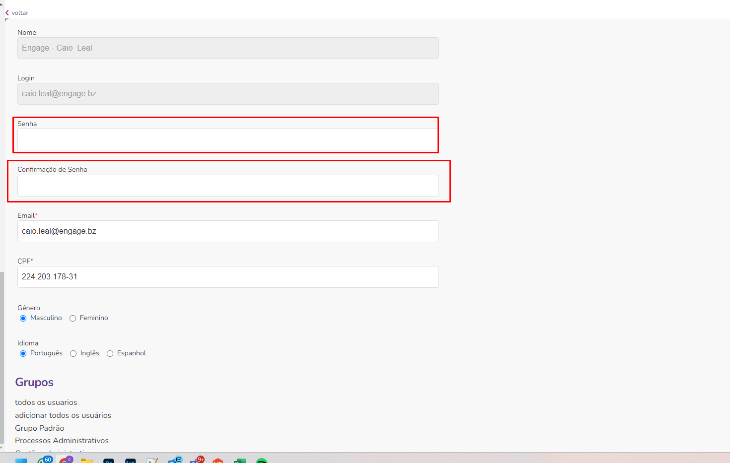 Os administradores da plataforma também têm a possibilidade de alterar a senha de qualquer usuário diretamente pelo menu administrativo: