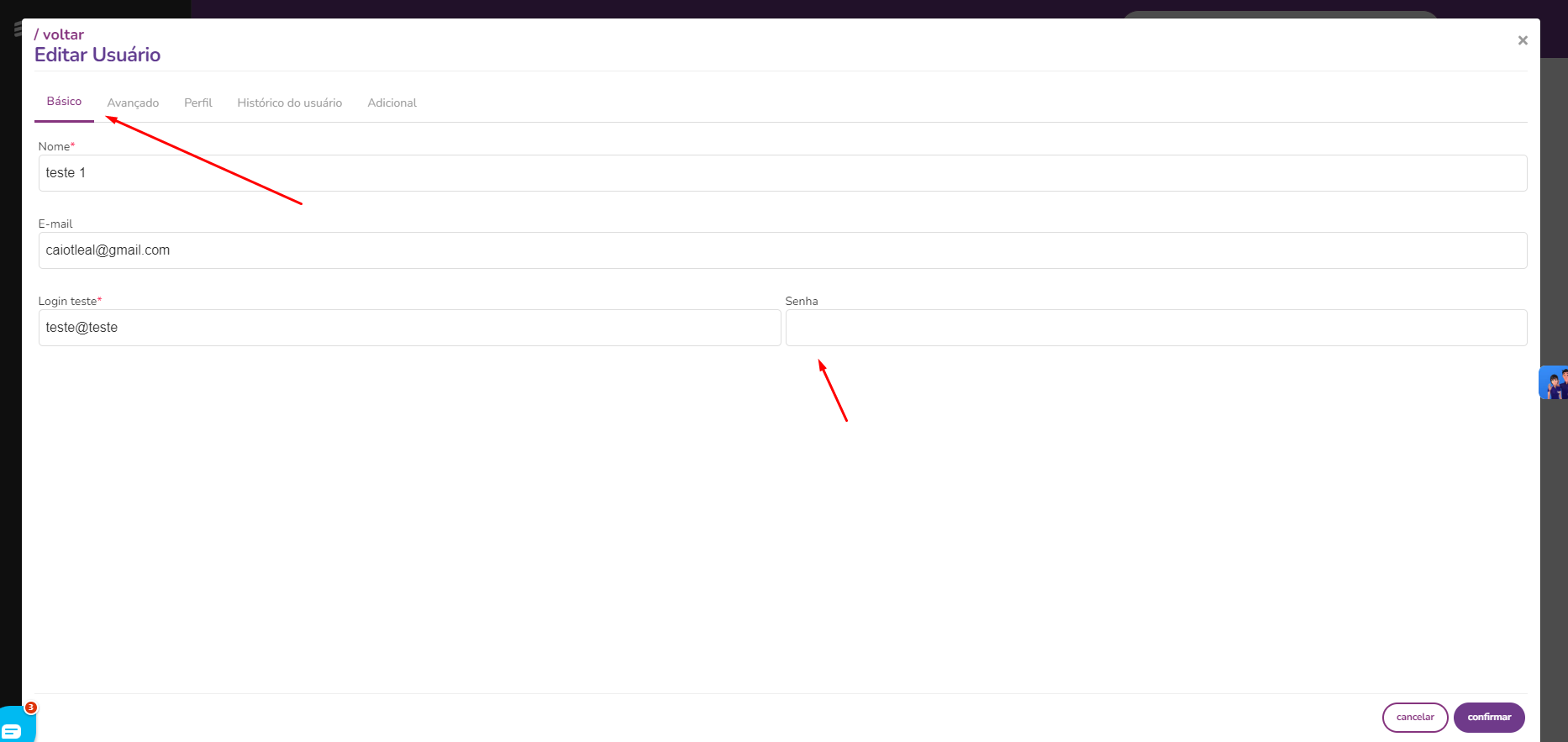 - Na aba "Básico" localize o campo "Senha", insira a nova senha desejada.