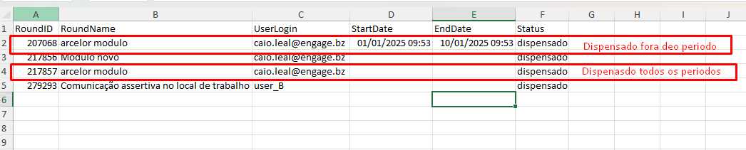 Na planilha, insira as informações sobre os módulos e os usuários que serão dispensados.
