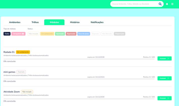 - Os módulos serão listados mantendo o agrupamento visual de Trilha e Ambiente.
