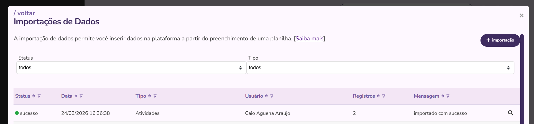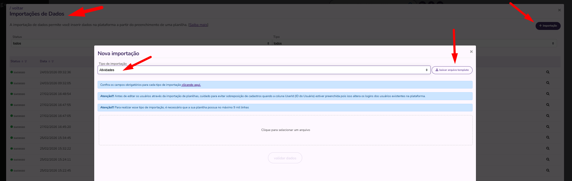 - Acessar o menu Outras Configurações, Importação de Dados, baixar o template Atividades.