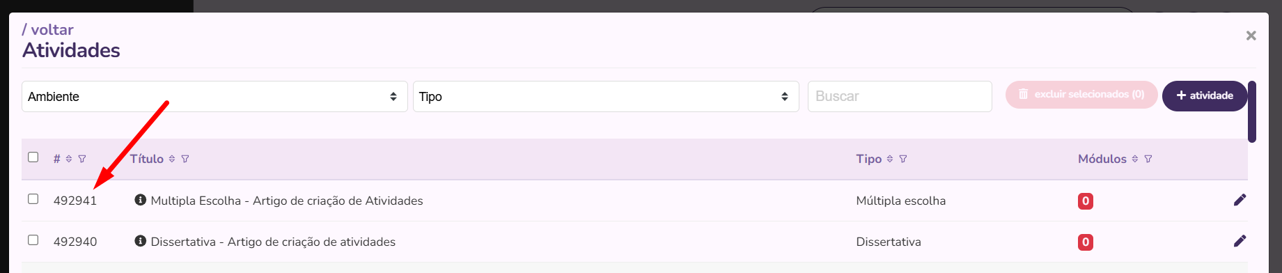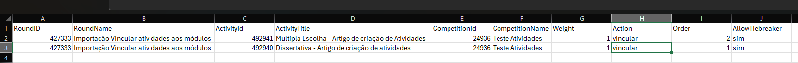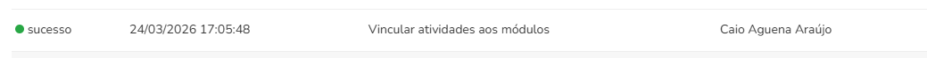 Com base no ID da Atividade obtido no menu Atividades, preenchemos o template Vincular atividade aos módulos da seguinte forma: