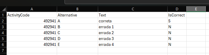 Com base no ID da Atividade obtido no menu Atividades, preenchemos o template Alternativas da seguinte forma: