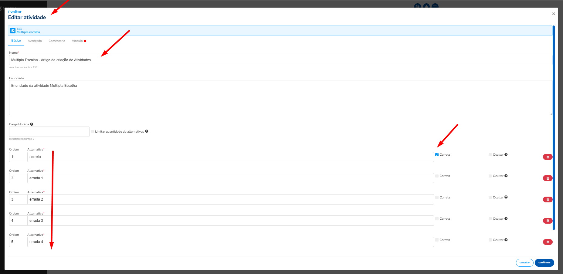 Seguindo com nosso exemplo, a atividade Multipla Escolha necessita de criação de alternativas.