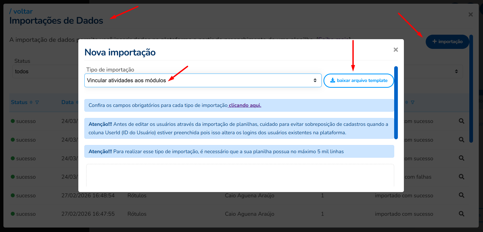 - Acessar o menu Outras Configurações, Importação de Dados, baixar o template Vincular atividades aos módulos.