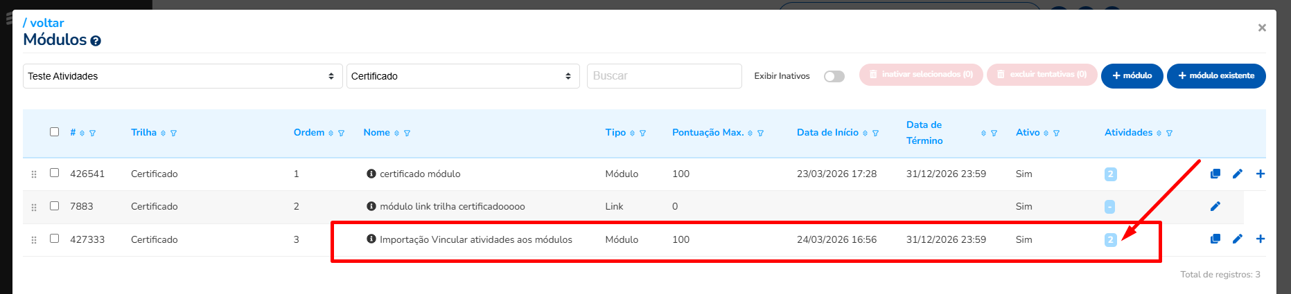 Passo 3: Vincular atividades ao módulo.