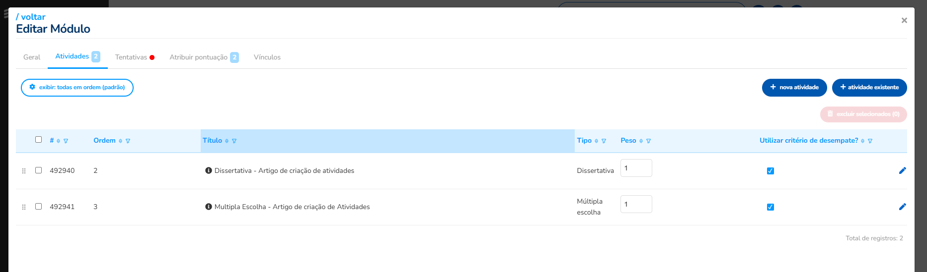 Para verificar se as atividades foram vinculadas, deve acessar as configurações dos Módulos e verificar a aba Atividades.