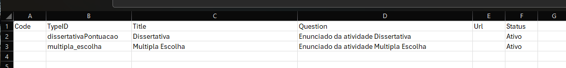 Abaixo um exemplo de importação para criação de atividades Dissertativas e Multipla Escolha.